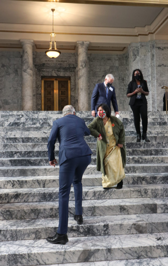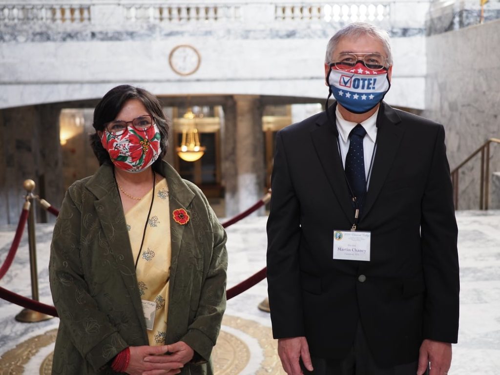 I’m sharing below a few photos taken while we were in Olympia at the Washington State Capitol for the 2020 meeting of the Electoral College. In one of the photos is former 45th District Democrats Chair Martin Chaney, who cast the 1st Congressional District’s vote for Joe Biden and Kamala Harris. I served as the alternate elector.